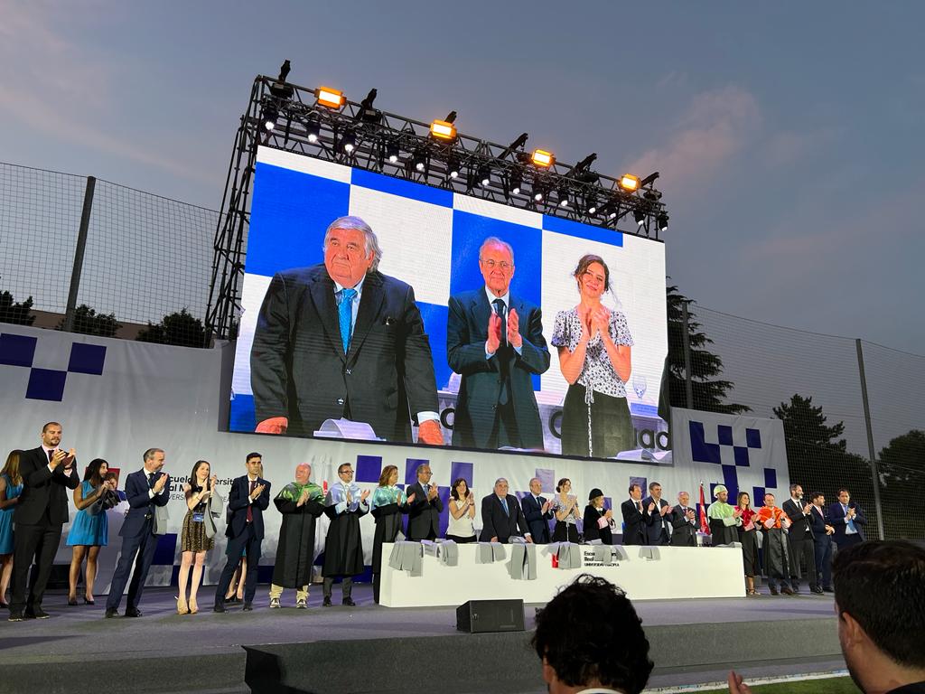 “Este va a ser sin duda uno de los actos de graduación más emocionantes de nuestra Escuela desde sus inicios. Tras estos duros años de pandemia hoy por fin podemos reunir aquí a las mujeres y hombres que forman parte de nuestras tres últimas promociones universitarias. Hoy recibís el reconocimiento del trabajo y del sacrificio por el esfuerzo y por vuestra capacidad de superación cada día. Os lleváis la recompensa de un título que os hace sentir orgullosos de lo que habéis conseguido, pero os lleváis también algo que será muy importante en vuestras vidas: un vínculo emocional para siempre con el Real Madrid, con el club más trascendente de la historia”.