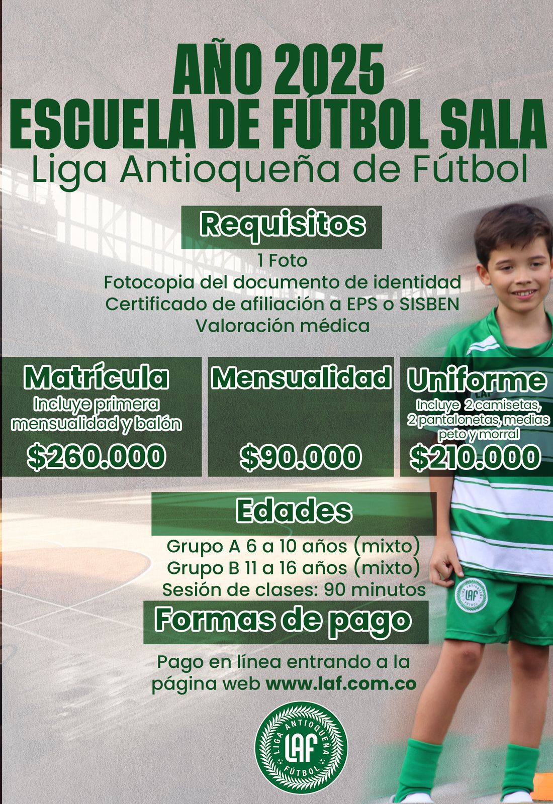 Matricúlate en la Escuela de la Liga Antioqueña de Fútbol Sala la mejor escuela de formación del departamento. Nuestra filosofía de formación está fundamentada en un modelo de trabajo acorde a la formación salonista, encaminados al desarrollo de los fundamentos técnicos de nuestros deportistas.